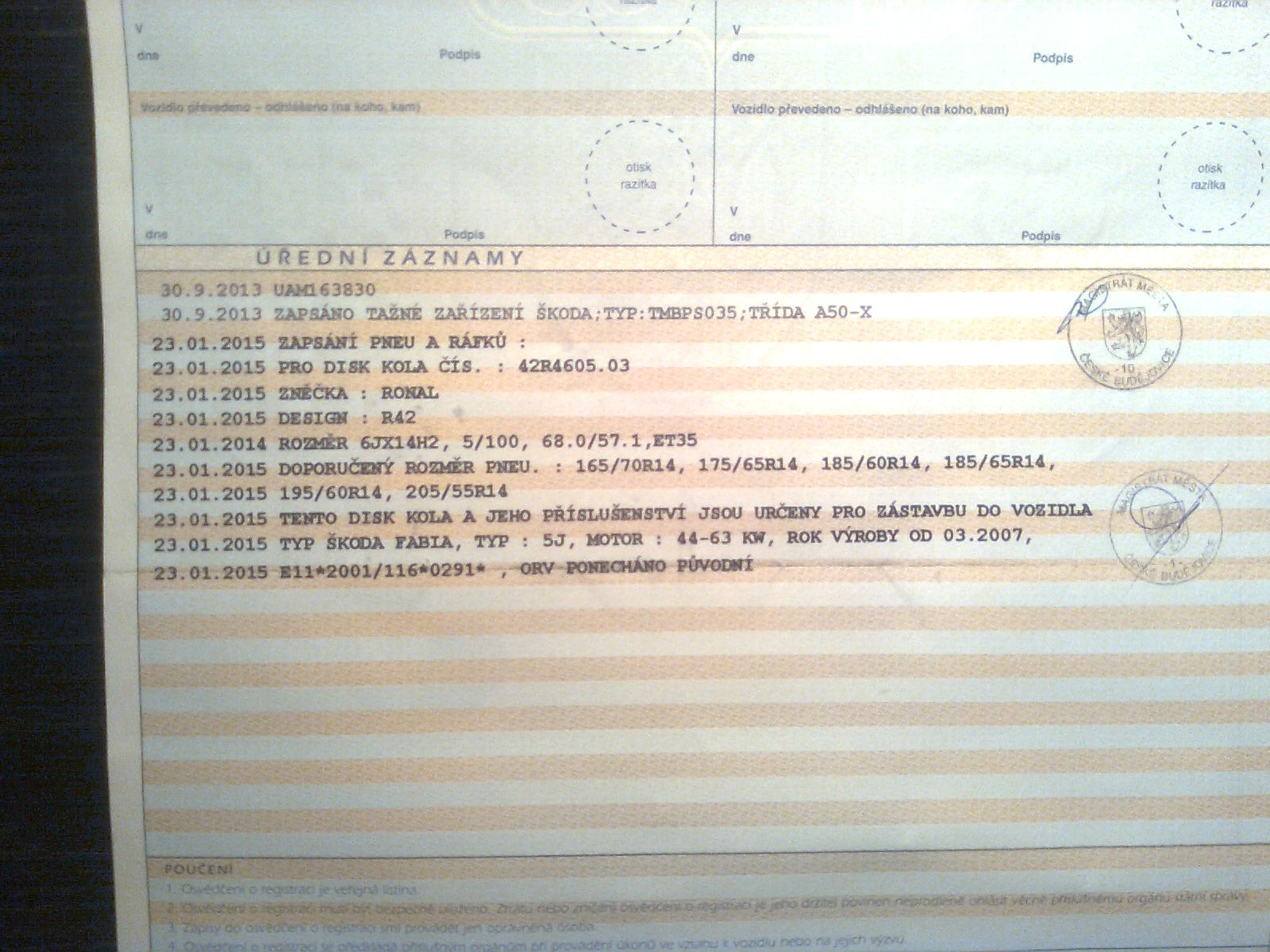 A uvedenou značku a model ráfků dodatečně zapsaných do TP nebrat v potaz.