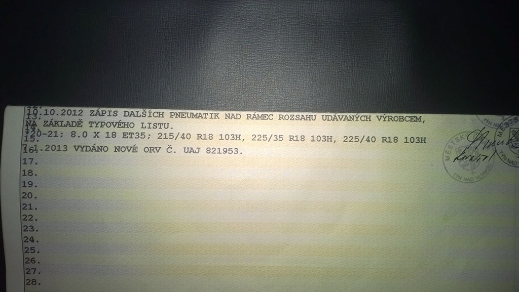 Zdravím, mám dotaz, pročítal jsem tento topic tak letem světem ale mám už takové nervy na ty naše úřady, že se prostě zeptám zde. Koupil jsem si nové alu kola na Octavii II 8x17 ET40 značky Borbet, mám k ním český typový list a německý TUV. Na STK kde jsem chtěl potvrdit TL mi řekli, že chtějí český překlad TUV - stačí mít ten stažený na mdcr.cz? Taky mi řekli, že ten český TUV budou chtít na úřadě, jak to tedy je? Byl jsme informován několika prodejci, že to nikdo nikdy nepotřeboval ten TUV česky a ani výrobce to nedodává.