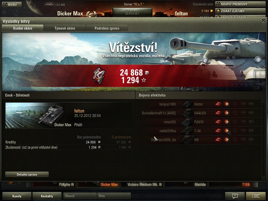 Bobek: Tak záleží, jak s těmi tanky hraješ. Neříkal jsem lepší, ale zábavnější :wink: Soudit, který tank je lepší, je těžké, s každým se hraje jinak, DB je kontaktní(hlavně když na něm je 88mm) a Panther je spíše mobilní TD(pokud má brčko). Ze začátku bylo DB pro mě jako za trest, ale teď s ním jezdím převážně jen dvojnásobky atp a celkem mě to s ním baví. Mám už na něm připravených 80tisíc zk a chci se dostat na 90tisíc, případně i víc, abych zkusil Tigera. S top výbavou je celkem obratný a dělo také celkem ubírá. Samozřejmě nesmíš střílet čelně do protivníka, to dělo takto nic neprostřelí, ale z boku to už je lepší ;)