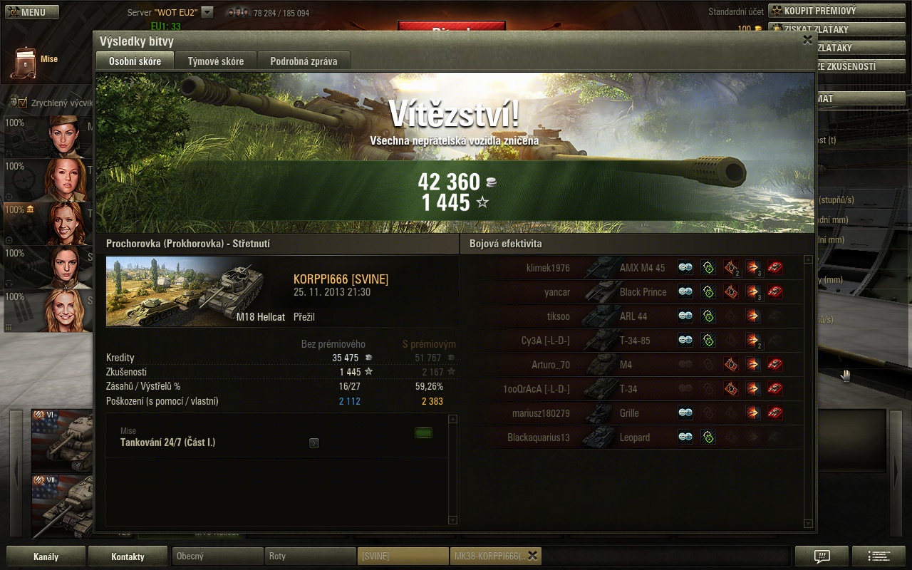 Získáno zkušeností: 4 476 (x3 za první vítězství každý den) Získáno kreditů 33 483