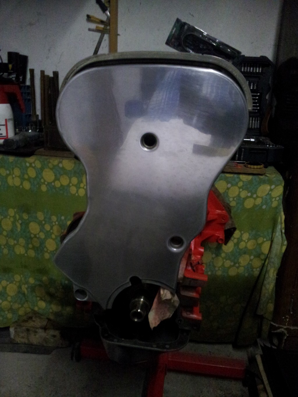 Postupně odstrojili tak, že zůstal jen blok s klikou,ojnicemi a písty. Hlava se nechá udělat. Na spodek chytat nehodláme. Z předchozího motoru jsem si nechal pro jistotu turbo, kabeláž, jednotku, amal ventil, sání, vstřiky... . Nakoupili se nějáký ty barvičky at to trochu vypadá k světu blok se foukl na červenou. Ventildekl a kryt rozvodů jsou ve fázi leštění.