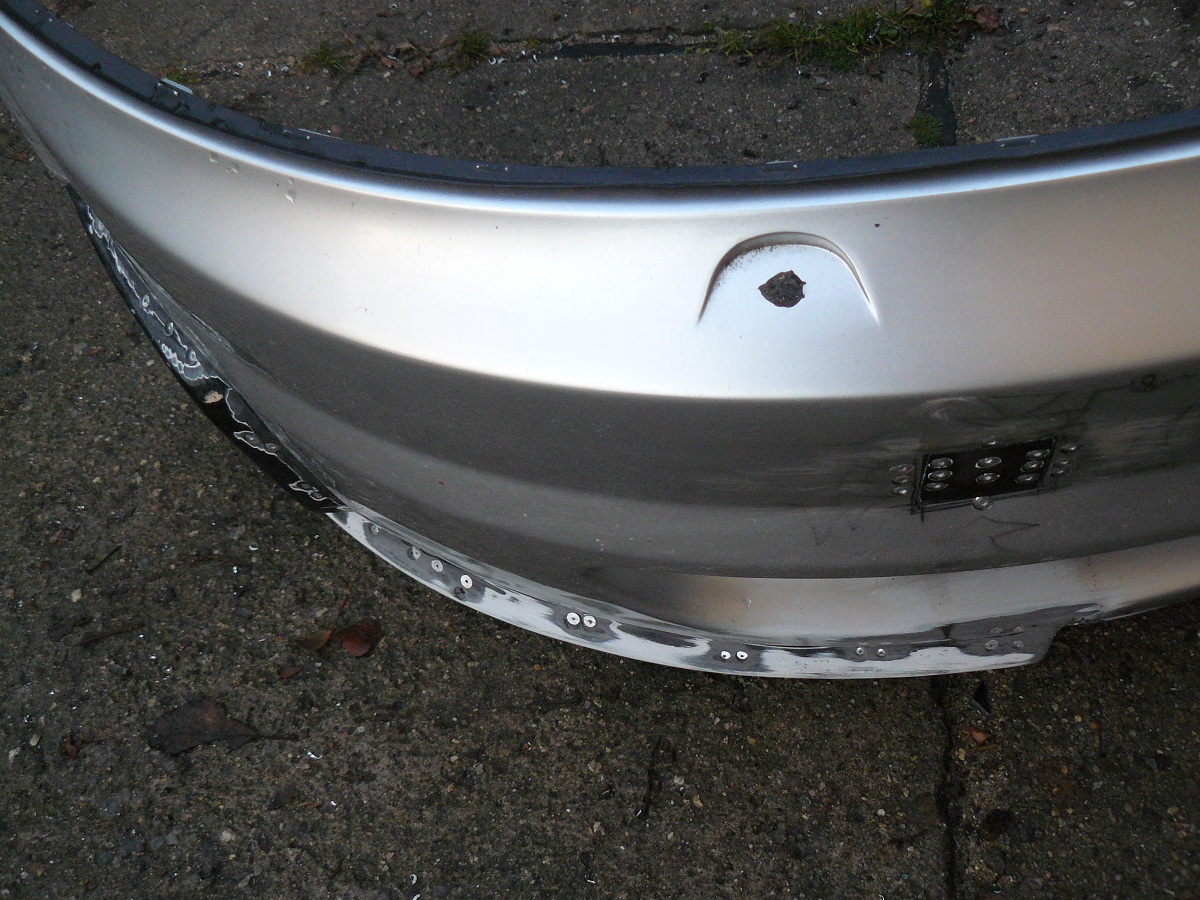 první stádium ihned z dalšími úpravami. zahlazena díra pro tažné oko, odstřikovače světel a prolis pro spz. v této podobě jsem nárazník odložil na nějaké měsíce stranou... o mřížku mě doslova okradl TomC20let