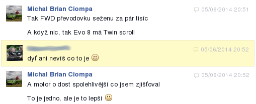 Ty se zase děláš zajímavější než jsi. Nic jsem s tebou neřešil. Ptal jsem se tě na cenu specifických Brembo brzdičů o kterých vím, že jsou pro moje auto plug and play (s tím, že se mrkneš, jestli v Polsku něco je, ale bylo to stejně nesmyslně drahý), pak jsme jenom lehce nakousnuli možnost výroby custom kotoučů. Dohromady to bylo možná nějakých 20 zpráv v FB chatu ? Což je nic oproti tomu, jak jsi ze mě neustále tahal rozumy ohledně převodovek, turbodmychadel, apod.