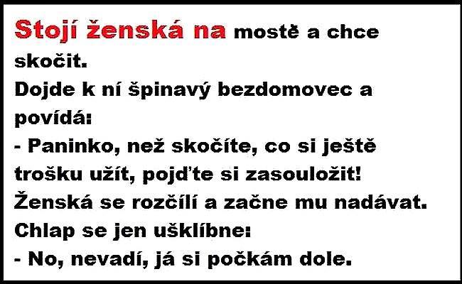 V porodnici. Maminka rodí, tatínek stojí za prosklenou stěnou. Zdá se, že vše probíhá v pořádku, sestřička už nese dítě směrem k tatíkovi. Najednou ho chytne za nožičky a začne s ním zuřivě mlátit o sklo, až všude stříká krev. Otec okamžitě rozrazí dveře, vletí dovnitř a celý běsní: "Proboha ženská co to děláte?!!!??! Sestřička v histerickém záchvatu smíchu odpovídá: "Ale to byla jen taková sranda, ono už stejně bylo mrtvý před tím!"