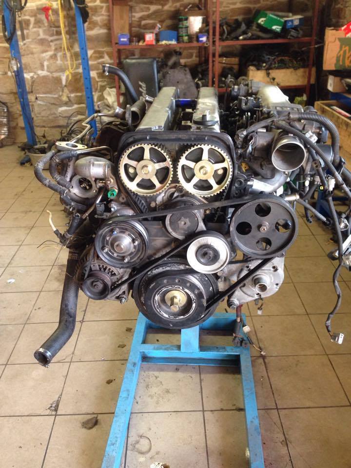 No konečně... na té fotce tam byl na špalku, kvůli výrobě držáků - ty eBay se kamarádovi zdály moc slabé a navíc jsme dospěli k rozhodnutí posunout motor lehce dopředu, aby se vyřešil problém s místem za zadním turbem (holt RHD auta tam mají víc místa). Teď už je to napevno a motor sedí v autě na nových custom držácích.