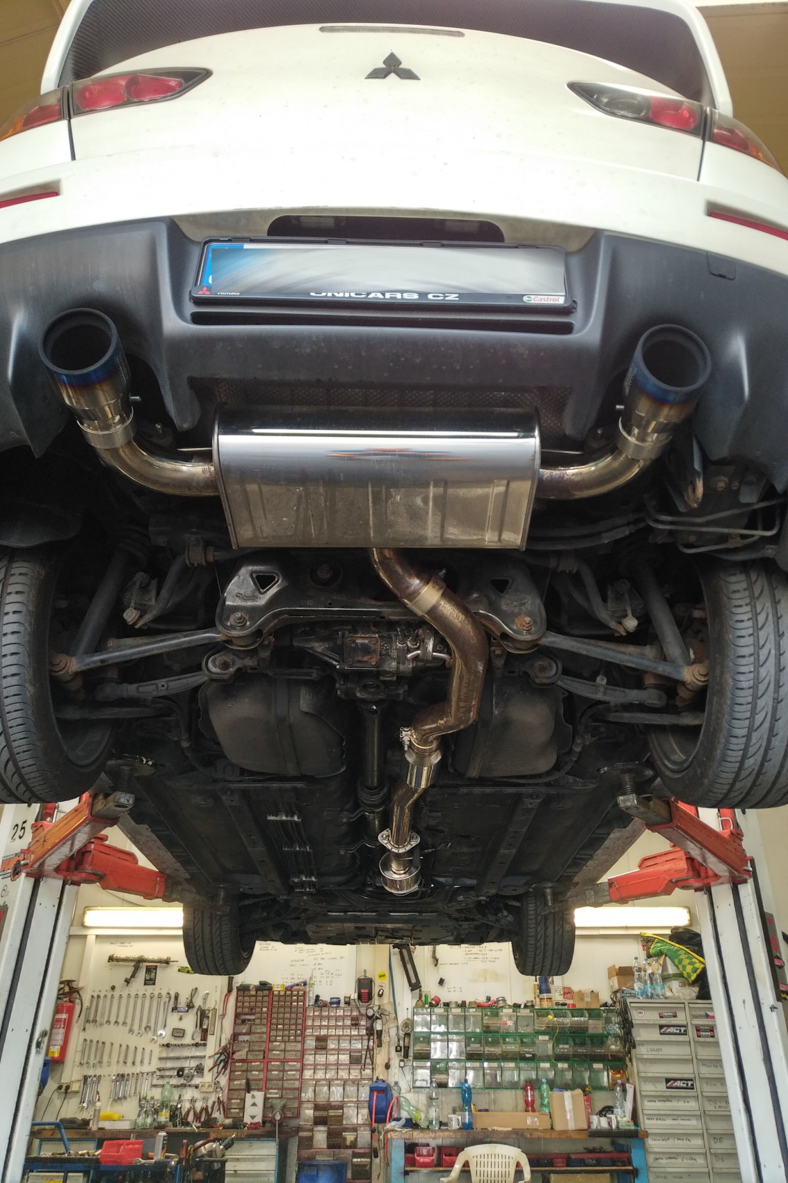 Tady je na 2,7 V6 turbo GT35 a úplně obyčejné plně průchozí tlumiče. Vnitřní kosntrukce klasika, děrovaná roura obalená vatou. Basové to je dost od spoda, ale v otáčkách se to pěkně rozeřve.