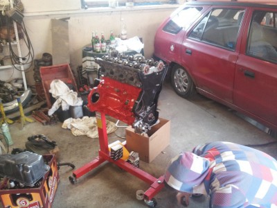 Postupně odstrojili tak, že zůstal jen blok s klikou,ojnicemi a písty. Hlava se nechá udělat. Na spodek chytat nehodláme. Z předchozího motoru jsem si nechal pro jistotu turbo, kabeláž, jednotku, amal ventil, sání, vstřiky... . Nakoupili se nějáký ty barvičky at to trochu vypadá k světu blok se foukl na červenou. Ventildekl a kryt rozvodů jsou ve fázi leštění.