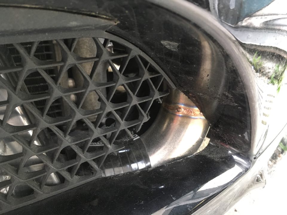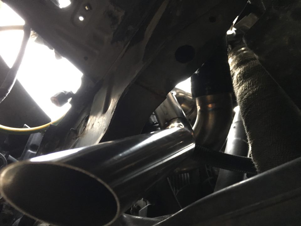 screamer pipe vyvedený před přední kolo - kámoš ho nechtěl, ale trval na zachování mlhovek, takže se to prostě jinak nevešlo