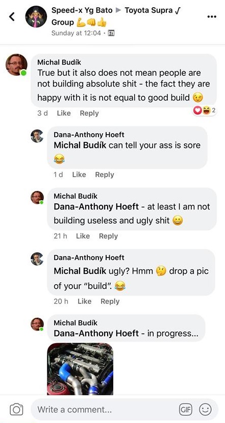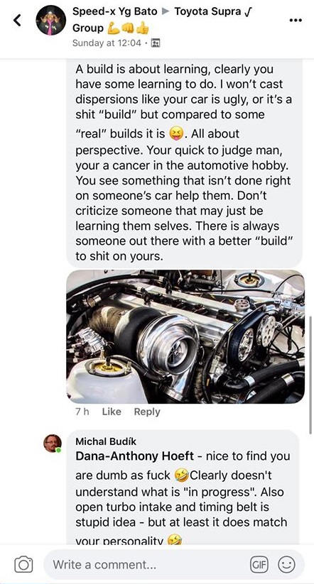 ROFL, Ciompa je koukám stejně blbej jako Hoeft (kterej si svoje auto s pochromovaným motorem koupil hotový od člověka, co ho skutečně stavěl) a stejně jako on zkouší něco posuzovat podle X měsíců staré fotky, kde to je v nedodělaným stavu :smich2: Vtipnější mi přijde, že v tom on vidí nějakej vtip a ze zoufalství to dává sem na TF, zatímco on sám včera ten jeho zázrak ani nebyl schopnej nastartovat :mrgreen:
