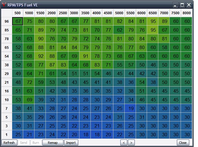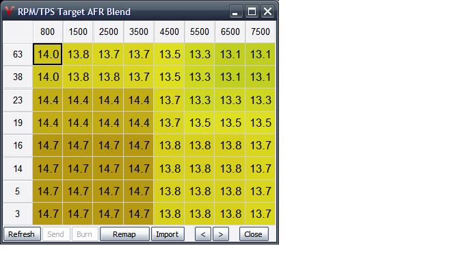 JRD: tuhle tabulku jsi mel vyplnit pred samotnym AFR ladenim. VEMS pres ni pocita finalni hodnotu PW. Cili pokud uz ted mas rekneme AFR za eko jizdy 15.4 naladene pres ne ci spatne vypnlenou tabulku a v konkretni pozici tabulky hodnotu zmenis, tak se ti o nejaky pomer zmeni i AFR(zavisi o to jak moc si hodnotu zmenil,resp jak moc byla predtim jina nez aktualni AFR).